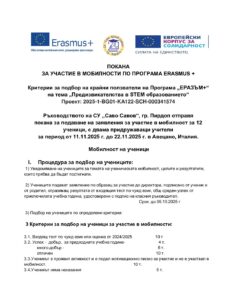 Критерии за подбор на ученици по ЕРАЗЪМ