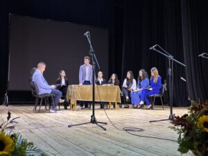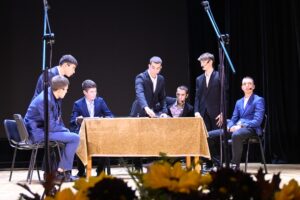 Момчетата от 10 клас влязоха в ролята на онези мъдри мъже от Пирдоп отпреди век, които тръгват по трудния път към новото и необходимото не само за образованието на децата от града. Разказаха как истината, че образованието е път към бъдещето на свое заседание вземат съдбовното решение как Прогимназията поетапно да се развие в пълна гимназия.
